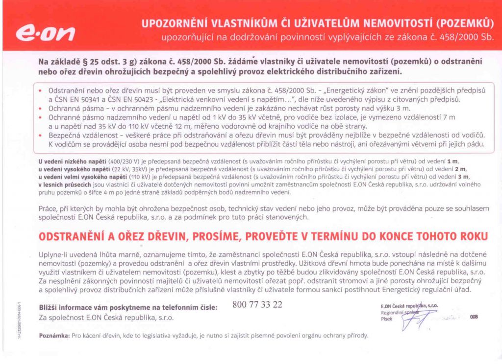 Upozornění vlastníkům lesa o odstranění a ořez dřevin ohrožujících spolehlivý provoz elektrického distribučního zařízení