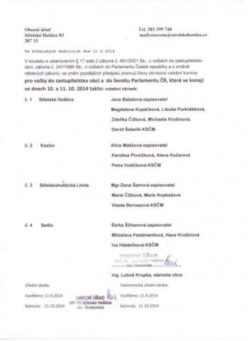Jmenování členů okrskové volební komise pro volby do zastupitelstev obcí s do Senátu Parlamentu ČR, které se konají ve dnech 10. a 11.10.2014.