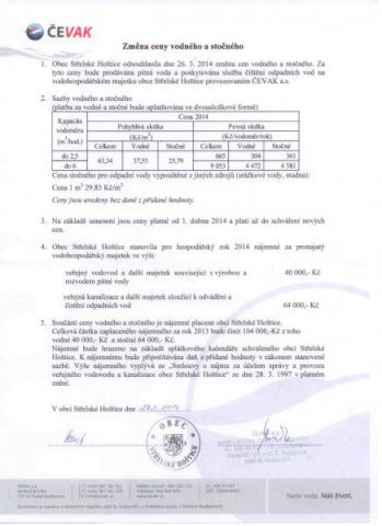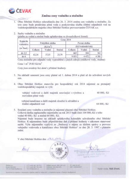 Obec Střelské Hoštice odsouhlasila dne 26.3.2014 změnu cen vodného a stočného /viz příloha/. Za tyto ceny bude prodávána pitná voda a poskytována služba čištění odpadních vod na vodohospodářském majetku obce Střelské Hoštice provozovatelem f. Čevak a.s.